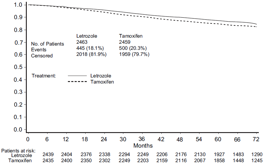 Fig. 2. Disease-free survival for patients treated with adjuvant letrozole versus tamoxifen. (From DailyMed. Femara (letrozole) tablet, film coated. Available at: http://dailymed.nlm.nih.gov/dailymed/drugInfo.cfm?id519740.)