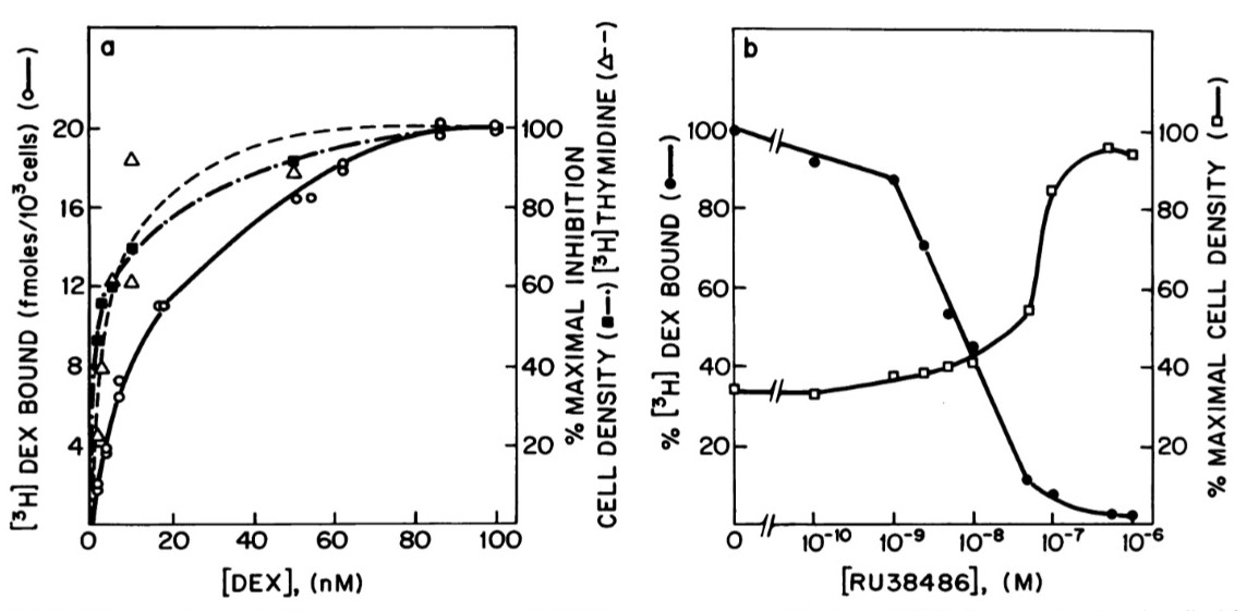 Figure 2. Effects of glucocorticoid receptor occupancy on Fu5 DNA synthesis and proliferation, (a) Fu5 cells were plated as described for Fig. 1 and incubated with the indicated concentrations of dexamethasone (DEX) for 3 days. Cell density was determined by assaying total DNA content (Fig. 1), while the amount of [3H]thymidine incorporated into trichloroacetic acid-precipitable material in 1 h was used to measure rate of DNA synthesis as described in the text. All values represent the average of triplicate cultures. The differences in cell density or [3H]thymidine incorporation between uninduced cells and cells treated with 1 pM dexamethasone represented the maximal inhibition, and all experimental values with the indicated steroid concentrations were compared to this value from which the percent maximal inhibition was calculated. Glucocorticoid receptor binding in extracts from subconfluent cells was monitored by a glass-fiber filter assay, using the indicated concentrations of [3H]dexamethasone. Each value presents one determination, (b) Fu5 cells were plated as described in the legend to Fig. 1 and incubated with 20 nM dexamethasone at the indicated concentrations of RU38486 for 4 days. Final cell density was monitored at each concentration of RU38486 by determining total DNA content, and the final cell density obtained in the absence of any added steroid was used as the 100% value to calculate percent maximal cell density. The inhibition of 20 nM [3H]dexamethasone binding to glucocorticoid receptors at the indicated concentrations of RU38486 in extracts from subconfluent Fu5 cells was analyzed by a glass-fiber filter assay, and the percent binding was calculated relative to the amount bound in the absence of RU38486. All values are an average of triplicate samples.