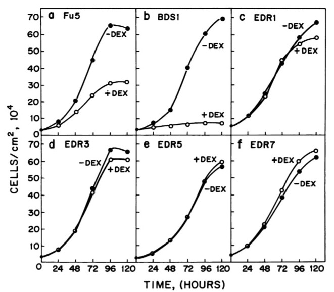 Fu5 cell populations were mutagenized with ethyl methylsulfonic acid, and dexamethasone-resistant variants that failed to be growth inhibited in the presence of glucocorticoids (denoted EDR) were recovered out as previously described (15). Briefly, mutagenized cell populations were cultured continuously for 11 months in 1 μM dexamethasone and single cell-derived lines were recovered by dilution subcloning.