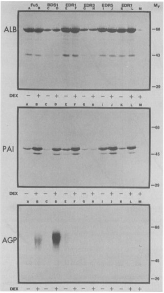 Figure 4. Expression of glucocorticoid-regulated and constitutive secreted proteins. Fu5 and its derived subclones were cultured in the absence (lanes A, C, E, G, I, and K) or presence (lanes B, D, F, H, J, L, and M) of 1 μM dexamethasone for 24 h and radiolabeled with [35S]methionine during the last 6 h. The culture media were harvested, and the expression of albumin (ALB; top panel), PAI (middle panel) and AGP (bottom panel) was analyzed by immunoprecipitation. Immunoprecipitated materials were fractionated in SDS-polyacrylamide gels, and radioactive proteins were visualized by fluorography. Lane M represents immunoprecipitations with nonimmune serum. Molecular weight markers are bovine serum albumin (68,000 Mr), ovalbumin (45,000 Mr), and carbonic anhydrase (29,000 Mr).