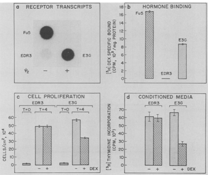 Figure 5. Restoration of normal hormone-regulated cell proliferation in EDR3 cells by introduction of functional glucocorticoid receptor genes. The EDR3 receptor-negative subclone was infected with recombinant retrovirus (VDG12*|>2) containing a functional rat glucocorticoid receptor gene linked to the neomycin resistance gene, (a) Expression of glucocorticoid receptor transcripts was monitored in the G418-resistant population of EDR3 cells (E3G) as well as wild-type Fu5 and variant EDR3 by a cytoblot assay as described in Materials and Methods, (b) Specifically bound 15 nM [3H]dexamethasone (DEX) was measured in Fu5, EDR3, and E3G cells as described in the text, (c) EDR3 and E3G were cultured in the presence or absence of 1 \JM dexamethasone for 4 days and assayed for cell proliferation as described in the legend to Fig. 1. (d) Conditioned media from EDR3 and E3G cultured in the presence or absence of 1 μM dexamethasone serum-free were harvested and added to quiescent BALB/c 3T3 cells. DNA synthesis was monitored by the incorporation of [3H]thymidine as described in the text.