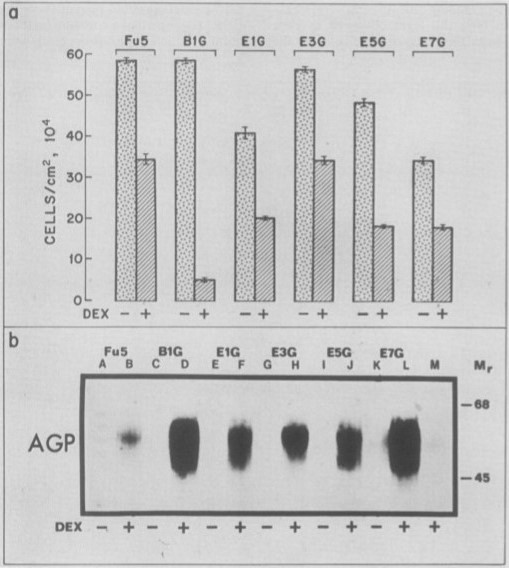 Figure 6. Glucocorticoid responsiveness of partially responsive, receptor-positive and nonresponsive, receptor-negative subclones after introduction of functional glucocorticoid receptor genes, (a) Functional rat glucocorticoid receptor genes were stably introduced into BSD1, EDR1, EDR3, EDR5, and EDR7 variaqt subclones (denoted BIG, E1G, E3G, E5G, and E7G, respectively) as described in the legend to Fig. 5. G418-resistant cell populations, as well as wild-type Fu5, were incubated in the presence or absence of 1 μM dexamethasone (DEX) for 4 days, and cell proliferation was determined as a function of total DNA content as described in the legend to Fig. 1. All values are an average of triplicate samples, (b) Fu5 and indicated G418-resistant cell populations were cultured in the absence (lanes A, C, E, G, I, and K) or presence (lanes B, D, F, H, J, L, and M) of 1 JJLM dexamethasone for 24 h and radiolabeled with [35S]methionine during the last 6 h of incubation. Radiolabeled media were immunoprecipitated with anti-AGP (lanes A to L) or nonimmune serum (lane M), and immunoprecipitated material was fractionated in SDS-polyacrylamide gels. Radioactive proteins were visualized by fluorography; molecular weight markers are described in the legend to Fig. 4.