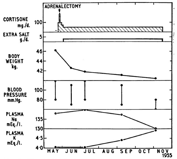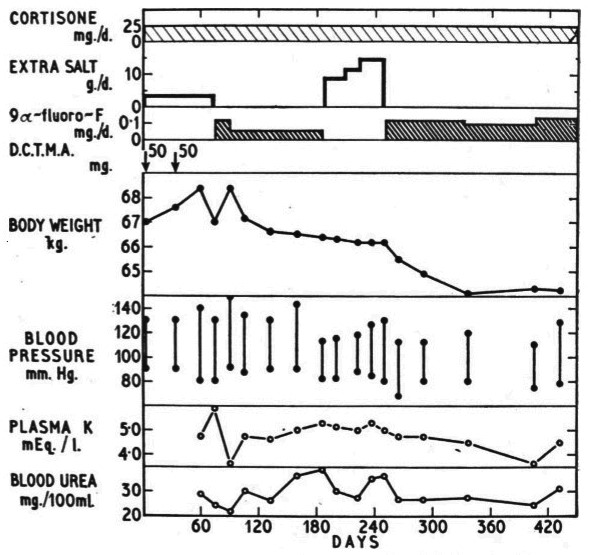 Figure 4. Married woman aged 52 treated for Addison’s disease. Attempt to substitute a greatly increased salt intake for fluoro- hydrocortisone. (The steady loss of weight in this period was the result of dieting.)