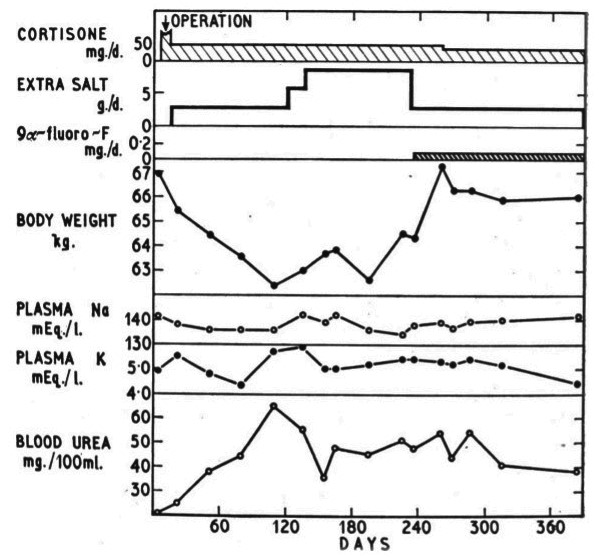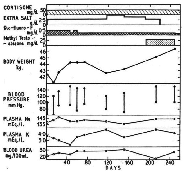 This patient had been receiving 25 mg. of cortisone a day and monthly injections of deoxycortone trimethyl acetate (Fig. 4). Fluorohydrocortisone was substituted for the latter, but the dose given (0.0625 mg. a day) was barely adequate. An attempt was made to replace the salt-retaining steroid by a greatly increased salt intake, but although the dose reached 15 g. of additional salt a day the results were disappointing. The patient subjec- tively was much less well and had thirst and nocturia. She is now well balanced on the same dose of cortisone and 0.125 mg. of fluorohydrocortisone a day.