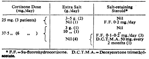 Oral cortisone acetate, 37.5 to 50 mg. daily, was the basis of replacement therapy. It was found that about one-third of those on 37.5 mg. and one-tenth of those on 50 mg. a day became sodium-depleted.