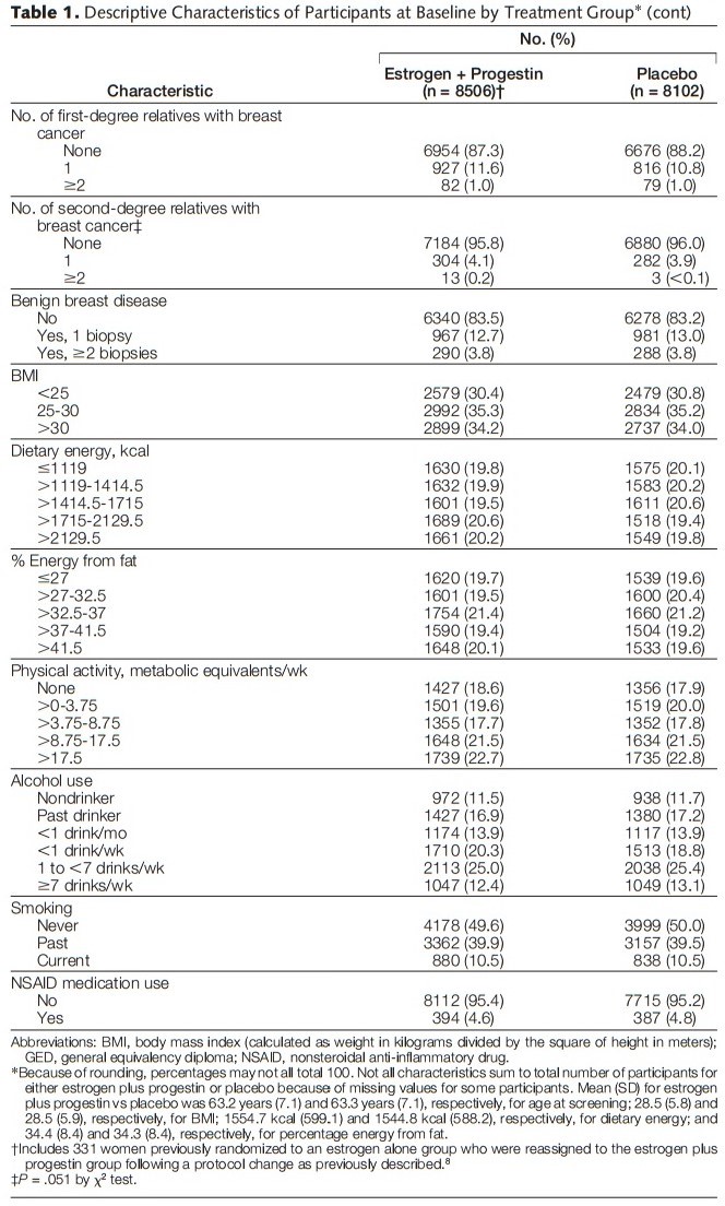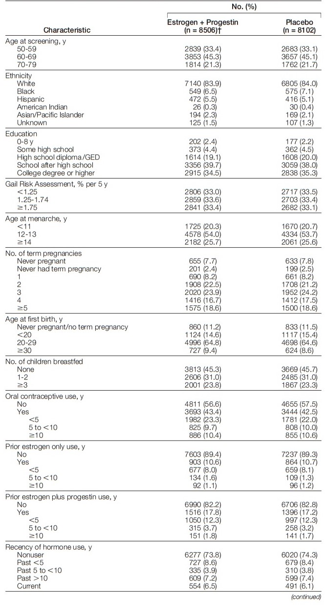 Women were randomly assigned to receive estrogen plus progestin taken as a single daily tablet containing conjugated equine estrogens (0.625 mg) and medroxyprogesterone acetate (2.5 mg) (Prempro, Wyeth Ayerst, Philadelphia, Pa) or to receive an identicalappearing placebo. Randomization by the WHI clinical coordinating center was implemented locally by using a distributed study database and study medication bottles with unique bar codes for blinded dispensing. Descriptive characteristics for the 2 groups were assessed at baseline (TABLE 1).