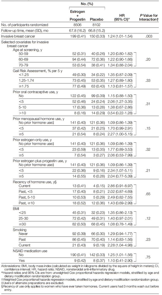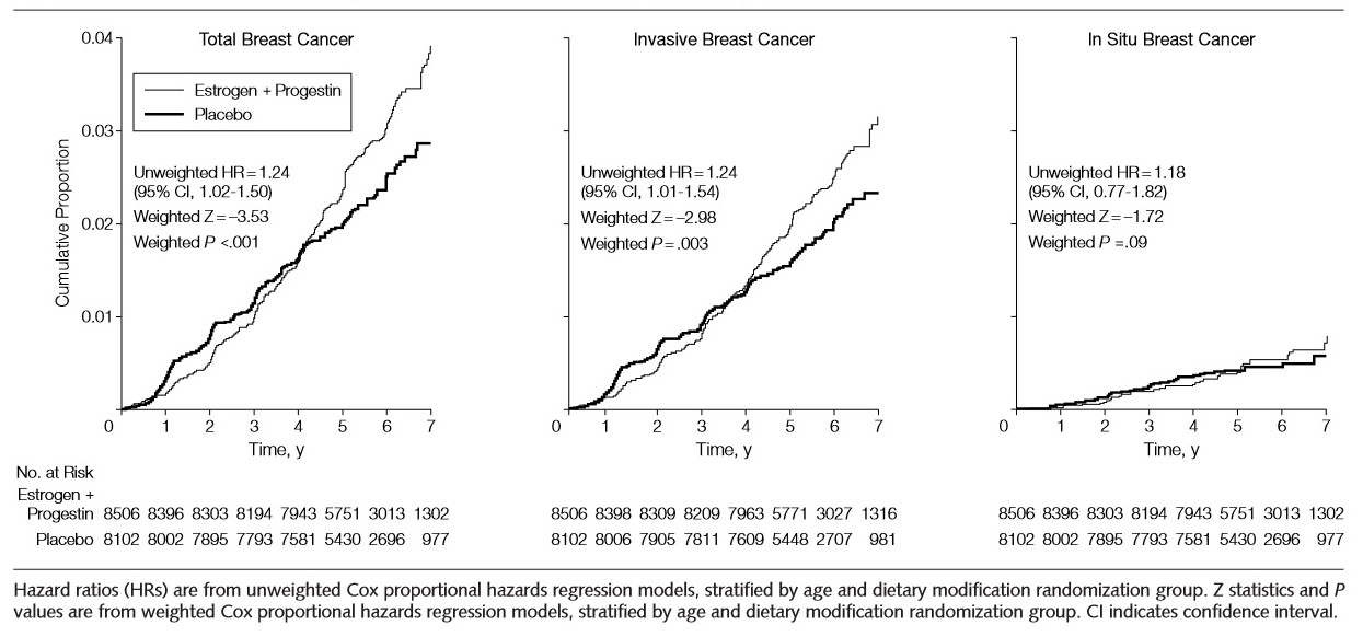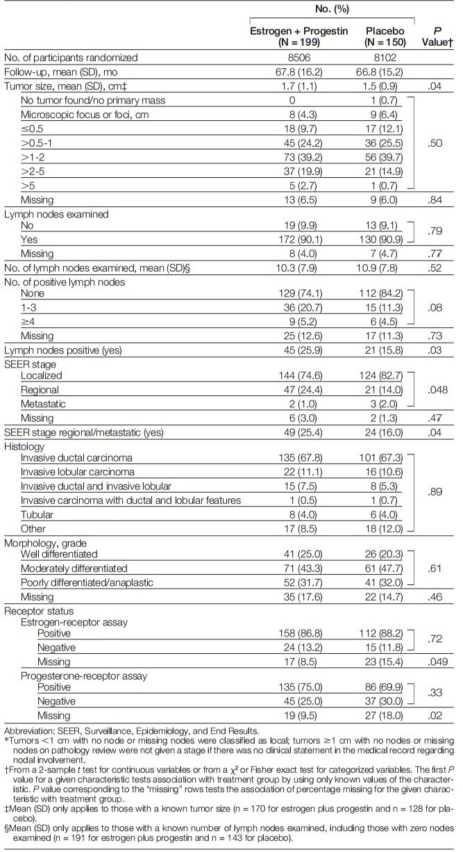 Results: In intent-to-treat analyses, estrogen plus progestin increased total (245 vs 185 cases; hazard ratio [HR], 1.24; weighted P<.001) and invasive (199 vs 150 cases; HR, 1.24; weighted P = .003) breast cancers compared with placebo. The invasive breast cancers diagnosed in the estrogen plus progestin group were similar in histology and grade but were larger(mean [SD], 1.7 cm [1.1] vs 1.5 cm [0.9], respectively; P =.04) and were at more advanced stage (regional/metastatic 25.4% vs 16.0%, respectively; P = .04) compared with those diagnosed in the placebo group. After 1 year, the percentage of women with abnormal mammograms was substantially greater in the estrogen plus progestin group (716 [9.4%] of 7656) compared with placebo group (398 [5.4%] of 7310; P<.001), a pattern which continued for the study duration.