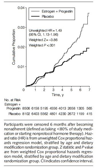 The strengths of the WHI study of estrogen plus progestin include the randomized double-blind study design, the large ethnically diverse study population, comprehensive and detailed assessment of a range of breast cancer risk factors at baseline, use of placebo controls, the requirement for baseline and ongoing yearly mammography and clinical breast examination in both study groups, and the central adjudication of the breast cancer end point via pathology report review. The rates of discontinuation of study medications in both study groups are limitations. However, these discontinuation rates are comparable with those observed in other trials of menopausal hormones and are less than observed in current clinical practice.[35] Furthermore, the discontinuation of study hormones in the WHI trial is likely to dilute the estimate of effects of estrogen plus progestin, suggesting that the underlying biological effect may be greater. Finally, the early stopping based on these results provides less precision and may have introduced some anticonservative bias in the HR estimates.
