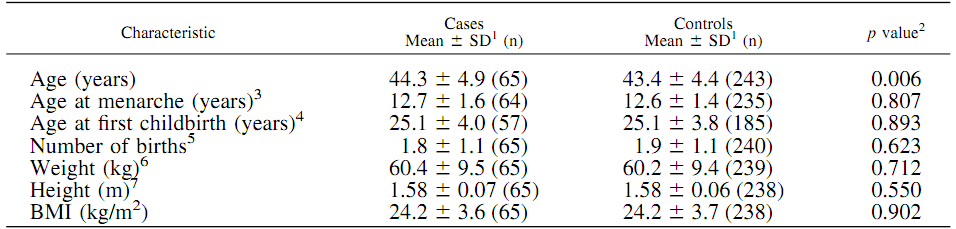 1Standard deviation.-2Student’s t-test for paired data was used for normally distributed variables (height and BMI); the Wilcoxon test for paired data was used for the other variables with nonnormal distribution.-3Information from 4 control and 1 case are missing; the 4 control women for the missing case were excluded.-4Based on parous women.-5Information for 3 control women missing.-6Information for 4 control women missing.-Information for 5 control women missing.