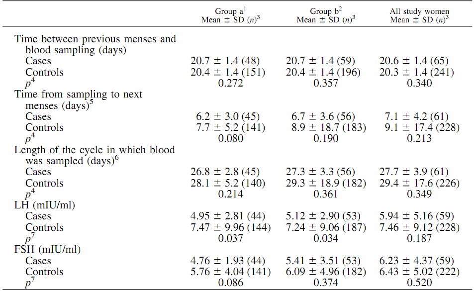 1Women with regular menses, i.e. , those with menstrual cycles at fairly regular intervals in the 6 months prior to blood collection.-2Women without marked menstrual irregularities, i.e., those with menstrual cycles at fairly regular intervals in the 6 months prior to blood collection or women with one missing period but at least 5 periods. Note: group b includes women of group a.-3Owing to missing data or control women excluded because the matched case was missed, the numbers differed through the different variables.-4Wilcoxon-test for paired data.-5Days-from-sampling-to-next-menses variable.-6Length-of- cycle variable.-7i-test for paired data.