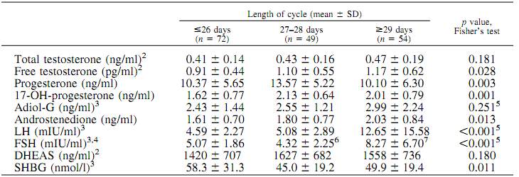 Table III shows mean serum levels of hormones and SHBG (measured on 20-24th day of the cycle) in 3 subgroups of group a control women defined by different cycle lengths. Hormone mean levels differed in these subgroups, significantly, for free testosterone, progesterone, 17-OH-progesterone, androstenedione, LH, FSH and SHBG.