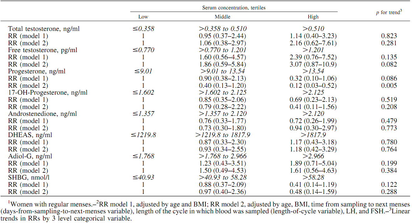 Repeatability studies have shown fairly high intraclass correlation coefficients for testosterone and progesterone measure- ments.15,40 We did not measure estrogen in our study because of the high intra-individual variation in estradiol levels in repeated blood samples taken on same day of subsequent cycles.15 Other prospective studies that measured estrogens have provided inconsistent results,7-10 although the 2 most recent studies8,9 suggested that estradiol levels are associated with BC risk.