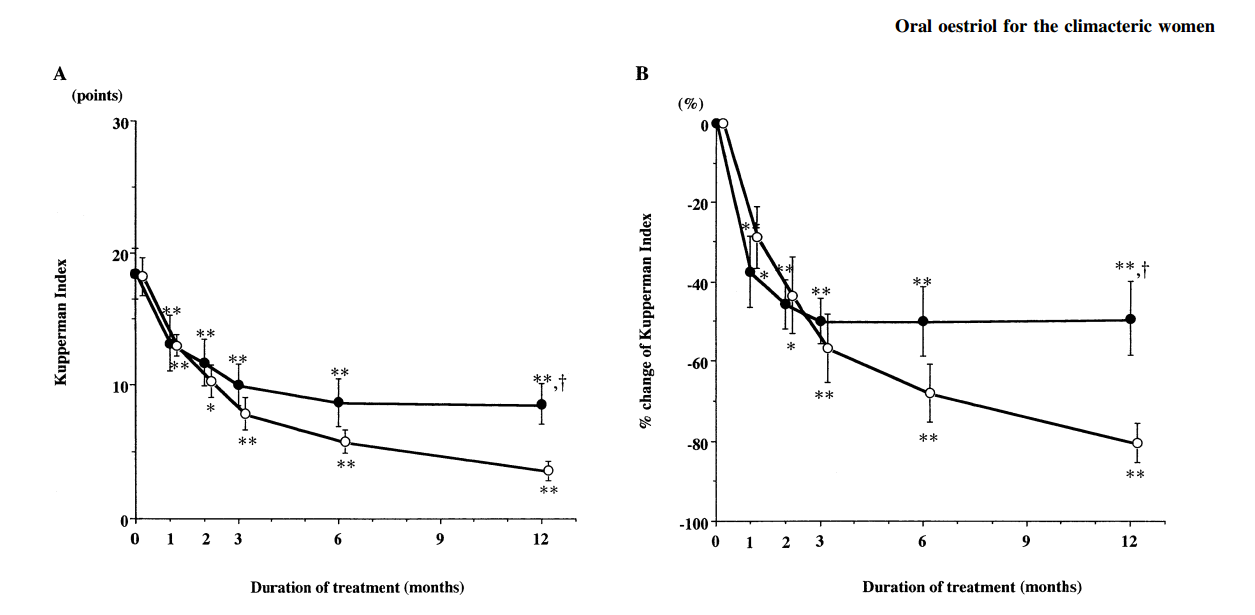 Figure 1. Mean scores (A) and percent change (B) in Kupperman index (KI). Mean scores before and after oestriol treatment in groups I (⚫—⚫) and II (O—O) are shown. Mean values are shown, SE is indicated by error bars. *P < 0.05; **P < 0.01 versus respective pretreatment values; †P < 0.05 versus group II group at that time.