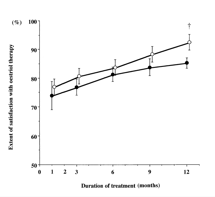 Figure 2. Satisfaction with oestriol therapy. Group I (⚫—⚫) and group II (O—O). Mean values are shown, SE is indicated by error bars. †P < 0.05 versus group I at that time.