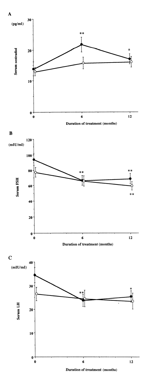 Figure 3. Changes in serum levels of oestradiol (A), FSH (B) and LH (C) during the 12 month period of oestriol treatment. Group I (⚫—⚫) and group II (O—O). Mean values are shown, SE is indicated by error bars. *P < 0.05; **P < 0.01 versus respective pretreatment values.