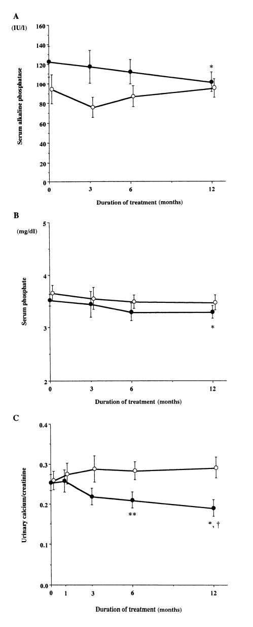 Bone mineral density (BMD) was assessed by use of the microdensito-metry (MD) method (Inoue et al., 1983). The BMD of the second metacarpal bone of each subject was measured by X-ray using the MD method before and after treatment. An X-ray of the hand was also taken with a reference aluminium step-wedge. In the MD method, three indices, such as the metacarpal index (MCI), the index of the densities of bone cortex and bone marrow (GSmin) and the index of bone density per unit length (sigma GS/D), were calculated by computer analysis of the X-ray of each hand. In addition, serum concentrations of calcium (Ca), inorganic phosphate (Pi), alkaline phosphatase (ALP), and urinary Ca were measured to evaluate bone metabolism. Serum concentrations of ALP and Pi were measured enzymatically with an automatic multi-purpose analyser (TBA200 FR, Toshiba Medical Products, Tokyo, Japan). Serum ALP was measured by the Quick Auto Neo ALP-JSII (Shino Test, Tokyo, Japan), intra- and inter-assay, 1.00 and 0.82% respectively. Serum Pi was measured with Determiner IP (Kyowa Medex, Tokyo, Japan), intra- and inter-assay CV, 1.02 and 4.53% respectively. Serum and urinary concentrations of Ca were measured by the orthocresolph- thalein complexone (OCPC) colorimetric method using OCPC fluid (Eiken Chemical, Tokyo, Japan) (intra- and inter-assay, 0.71 and 37% respectively). The urinary excretion of Ca was corrected for urinary creatinine (Cr).