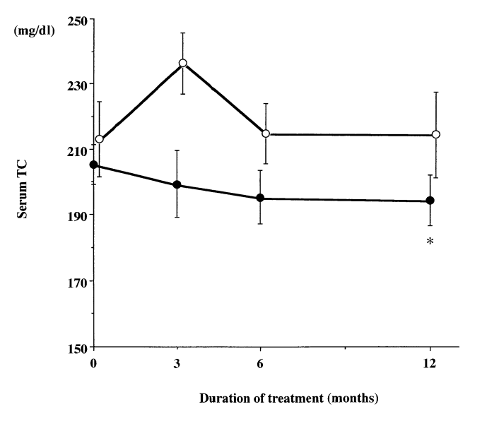 Figure 5. Changes in serum concentrations of total cholesterol (TC) during the 12 month treatment with oestriol. Group I (⚫—⚫) and group II (O—O). Mean values are shown, SE is indicated by error bars. *P < 0.05 versus pretreatment values.