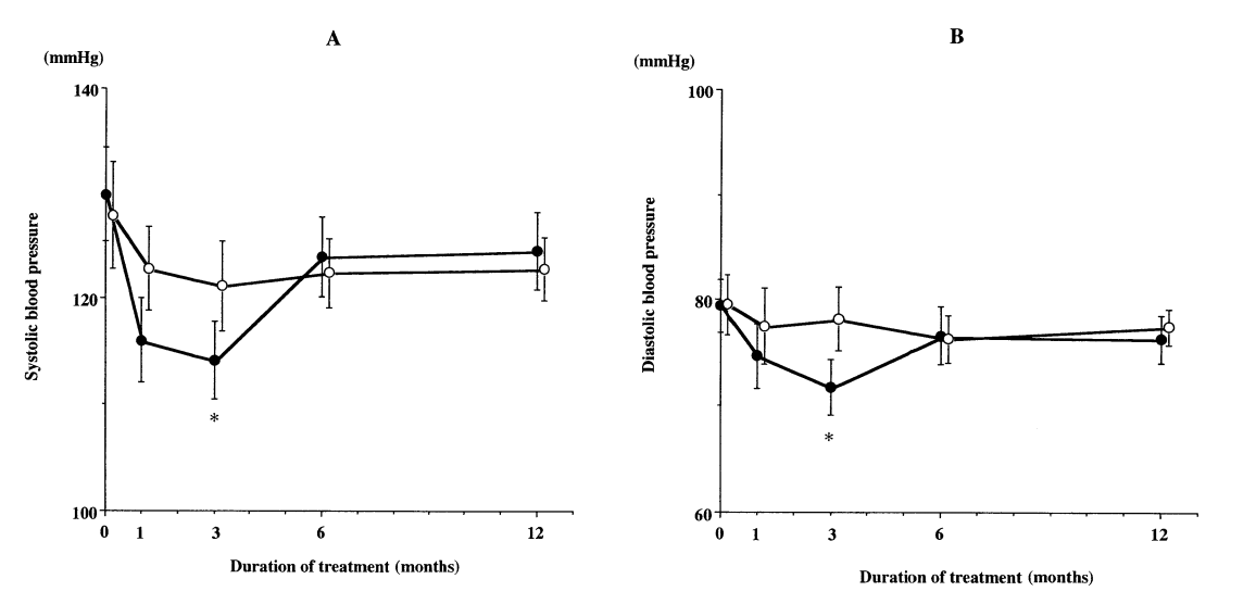 Changes in blood pressure before and during treatment are shown in Figure 6. No statistically significant changes in blood pressure were observed in group II during the 12 months of treatment. However, in group I, the mean systolic pressure (114.2 ± 15.2 mm Hg) and diastolic pressure (71.7 ± 10.8 mm Hg) each showed a significant decrease (P < 0.05) at 3 months as compared with pretreatment values respectively.