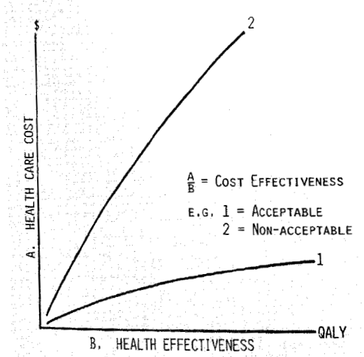 Figure 1. Cost effectiveness is illustrated as the ratio of health care costs to health efectiveness of the therary under scrutiny.
