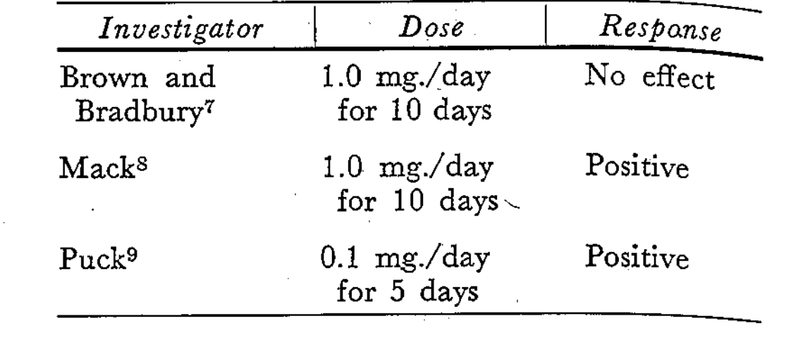 Discrepancies in the results of estrogenicity studies concerned with the clinical effectiveness of estrioi in humans were also noted. When, estrogenicity was determined by vaginal cytology, Table III, Brown and Bradbury7 were unable to demonstrate a positive effect with 1 mg. of estrioi daily for 10 days. Mack,8 however, with, the same dosage schedule demonstrated a positive cytologic effect similar in order to that achieved with estrone, estradiol, and stilbes- trol. Puck9 observed a positive vaginal cytologic effect with 0.1 mg. estriol daily for 5 days.