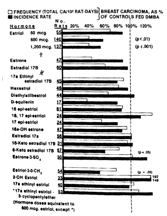 In systematic testing of various hormones for their potential anti-mammary carcinogenic activity in ! intact female rats fed mammary carcinogens and observed for their natural life span, only uncon- jugated oestriol, oestriol-3-methyl ether, and 6 keto oestradiol have significantly reduced breast cancer incidence (Lemon 1978, 1975). Highly uterotropic oestrogens, such as 17α-ethinyloestradiol, hexes- trol, and diethylstilbestrol, none of which can be metabolized to oestriol after absorption in the rat, do not alter experimental breast cancer incidence administered in doses equimolar to oestriol (Fig. 2). In addition to these oestrogenic derivatives, testosterone, corticosterone and progesterone have not demonstrated any anti-mammary carcinogenic activity (Lemon 1975). Oestriol protects against breast carcinomas induced by two highly dissimilar carcinogens (DMBA and procarbazine), and the prophylactic action is dose-dependent up to a point. Thus far, significant protection has not been observed against radiation-induced breast cancers. Repeated but intermittent therapy is required for protective activity during the entire life span of the animal. Oestriol was administered subcutaneously in NaCl pellets every 1-2 months. Pellet absorption was complete after 2 weeks, yielding transient high concentrations of unconjugated oestriol (Fig. 3). Oestriol derivatives with prolonged biologic action, such as 17α-ethinyloestriol-3-cyclopentyl ether, were ineffective in reducing breast cancer incidence in equimolar concentrations and demonstrated increased uterotropic activity. The incidence of non-breast neoplasms was not significantly altered by oestriol in DMBA and procarbazine fed rats, but has been reduced thus far in irradiated rats (Fig. 4).