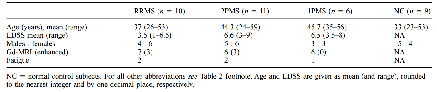 Data were obtained from 52 multiple sclerosis patients in four groups (relapsing-remitting multiple sclerosis : secondary progressive multiple sclerosis : primary progressive multiple sclerosis = 19 : 21 : 12), also from five patients with other neurological diseases and 10 normal control subjects. The mean ages (range) in these five groups were 39.8 (25-68), 43.2 (24-70), 46.4 (32-57), 42.4 (19-60) and 33.1 (24-53) years, respectively. There were no significant differences between the groups for free T3, free T4 or TSH (data not shown).