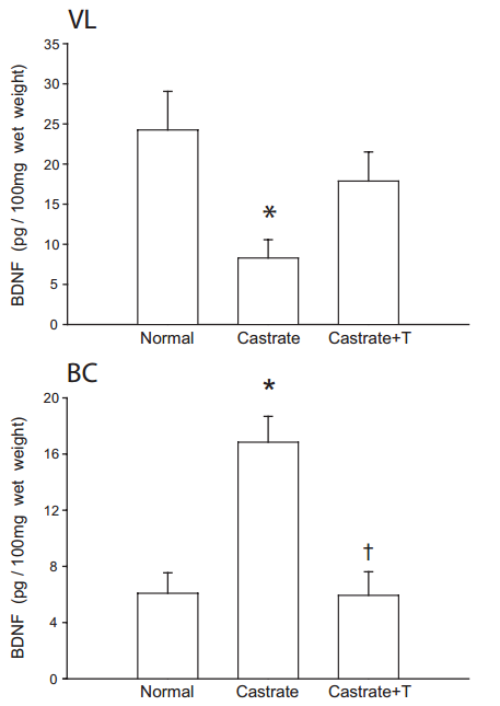 Figure 3. BDNF protein concentration (picograms per 100 mg wwt) in VL muscle (top) and BC muscle (bottom) by ELISA determination in normal males, castrated males, and castrated males treated with testosterone (T). Bar heights represent means ± SEM. *, Different from normal males; †, different from castrated males.