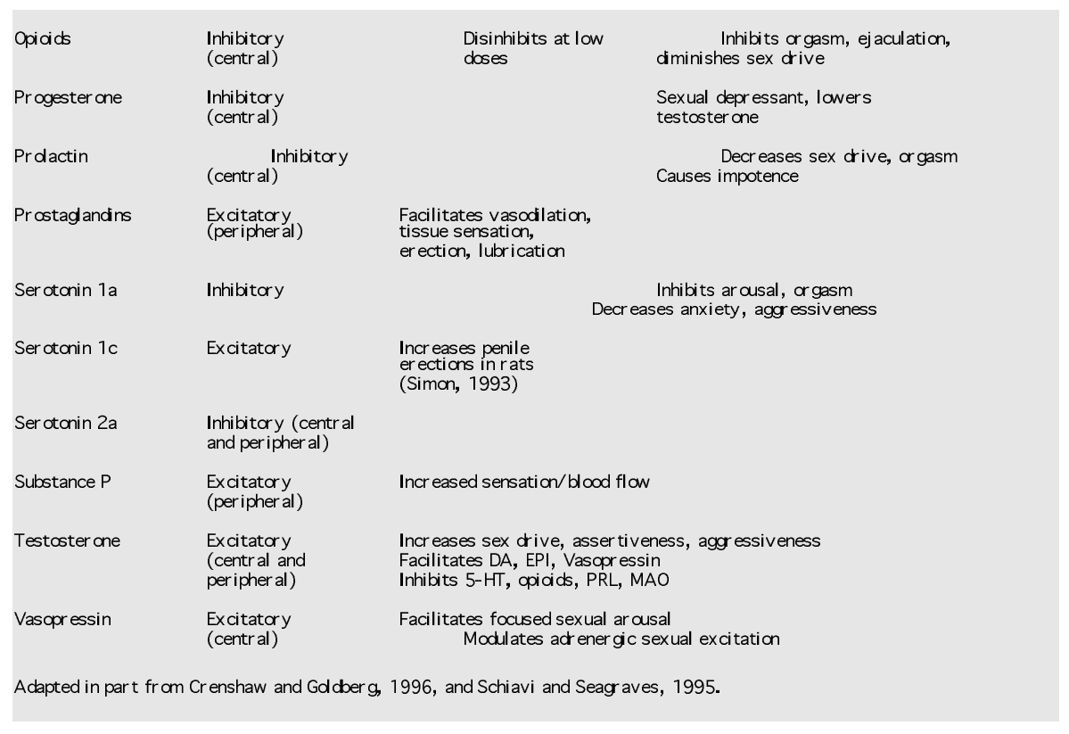Human sexual activity is modulated by a number of neurotransmitters (Table 1). The principal neuroanatomic areas that control sexual behavior include the medial forebrain bundle, the medial preoptic-anterior region of the hypothalamus with its related limbic-hippocampal structures, and the ventral tegmentum of the midbrain.[1] Sex hormones (e.g., estrogen, progesterone, and testosterone) substantially influence the neurotransmitter actions that modulate sexual behavior. These interactions, both on a central and a peripheral level, account for intricate modulations of sexual arousal, functioning, and pleasure.[2]