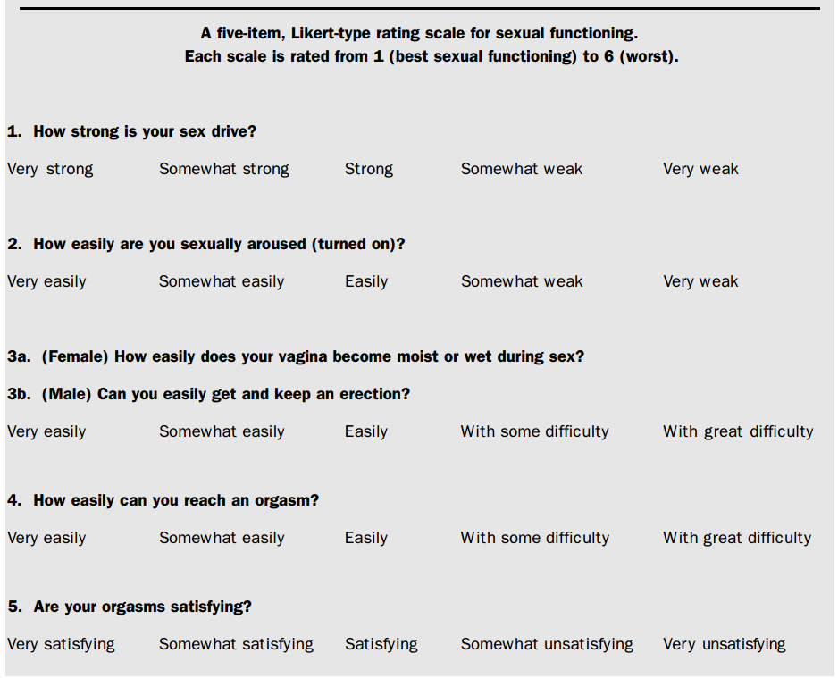 The physician can easily qualify and quantify the extent of the disorder. For example, the Arizona Sexual Experiences Scale73 is a five-question, Likert-type questionnaire that takes 5 to 10 minutes to administer and has been perceived by patients as relatively nonintrusive (Table 3). Individual questions score desire, arousal, male erection or female lubrication, and satisfaction with orgasm. Total ratings range from 5 to 30, with a score of 15 to 18 indicating average sexual function. Changes in sexual functioning can be evaluated at each visit and correlated with changes made in dosing and/or changes to other medications.