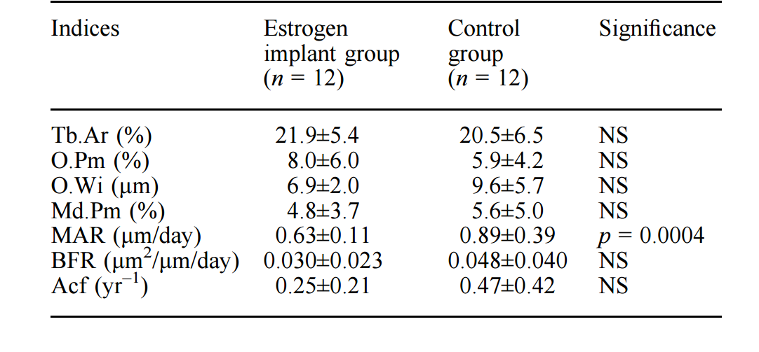 Because of the lack of availability of fresh histologic sections in the control group of premenopausal women, it was not possible for tetracycline-based measurements to be performed by the same observer. It is therefore possible that the significant differences in mineral apposition rate and its derived measurements, bone formation rate at tissue level and activation frequency, from the implant-treated women might have arisen from inter-observer variation and these data thus have to interpreted with some caution. This would also explain the apparent contradiction in the observations that mineral apposition rate was lower but wall width higher in the implant-treated women when compared with values in premenopausal women; alternatively, it is possible that mineral apposition rate had previously been higher but decreased when the dose of estradiol was reduced. Nevertheless, the values for bone formation rate and activation frequency in the implant-treated women were very similar to those measured, by the same observer, in women with postmenopausal osteoporosis after 2 years of treatment with conventional hormone replacement therapy [31], suggesting that bone turnover was relatively suppressed in the women treated with estradiol implants.