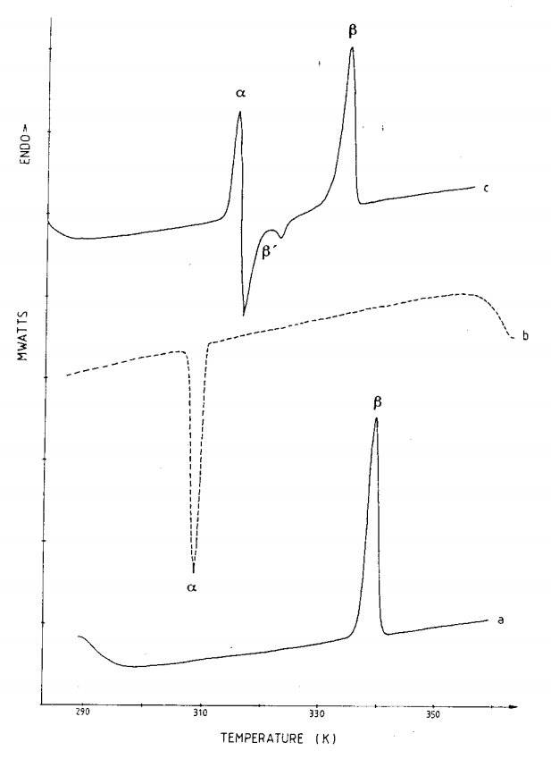 Figure 1. DSC thermograms of pure tripalmitate (scan rate: 10 K minβ5 ). (Curve a) First heating scan of thermally untreated sample; (curve b) cooling scan after holding at 353 K for 15 min; (curve c) second heating after cooling the melt to 293 K and holding at this temperature for 15 min.