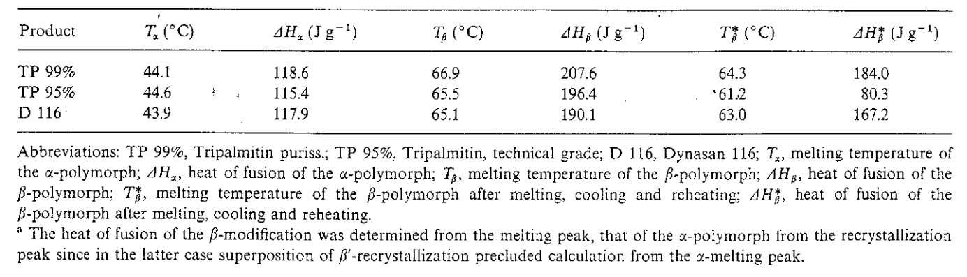 The presence of minor amounts of monoglycer-ides and diglycerides, even at concentrations below 1%, can delay the formation of the stable fi- polymorph in triglycerides and to some extent preserve the α- and βi'-modifications [12,13]. Thus, melt-crystallized tripalmitate (Tripalmitin, technical grade) displays a pronounced β-peak on reheating after 2 weeks of storage. The proportion of the β-modification calculated from the heat of fusion is larger than 85%. Even in the presence of phos-pholipids which accelerate the polymorphic trans-formation into the β-modification [14], fractions of the α-polymorph can still be detected in the thermally stressed bulk material beside the β'- and β modifications after 3 months of storage (Fig. 2). After 5 months of storage the β'-modification repre-sents the major polymorph whereas the β-phase can no longer be detected.