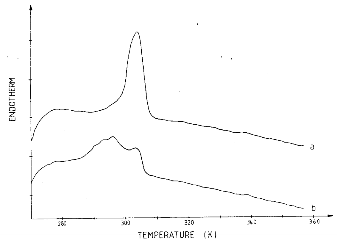 Figure 6. DSC thermograms of a dispersion of 10 wt.% tripalmitate and 1.2 wt.% sodium glycocholate: (curve a) 2 h after preparation; (curve b) stored at 4°C for 7 days (scan rate: 10 K min -1J.