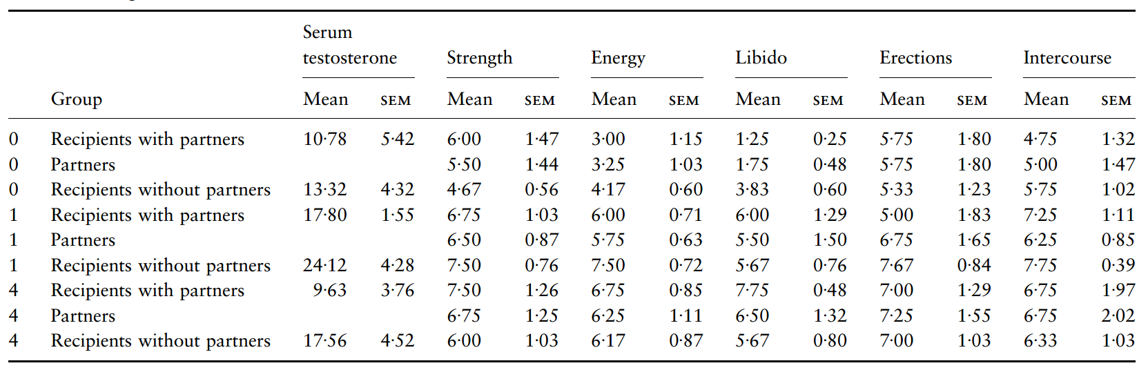 Results. The three groups reported similar effects of testosterone on well-being and sexual functioning. Recipient and partner ratings were also similar. Strength was less affected by decreasing testosterone concentration than energy in men with partners, but both strength and energy declined in men without partners. Decreased testosterone levels had a statistically significantly different effect on libido at time zero between men with and without partners (P < 0-015) and on ability to sustain an erection, but the ability to achieve an erection persisted over the 6 months in both male groups. Intercourse frequency increased from once per week at time 0 to >3 per week between 1 and 4 months after implant in men with partners. There were important effects of testosterone deficiency on general and sexual relationships, and these differed between men with partners and those without. Conclusions. Testosterone has important physical and psychological benefits that may be related to the age at which testosterone replacement commences and the indications for its use. The small sample size may limit the ability to generalize the findings outside the study.