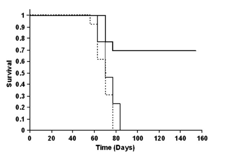 Figure 3. Survival analysis of the tumor progression of non-treated (broken line), naive hydrogels (solid line) and 131I-NC-Ct (bold solid line) implantation groups in neoadjuvant therapy model. Time scale relates to days after gels implantation.