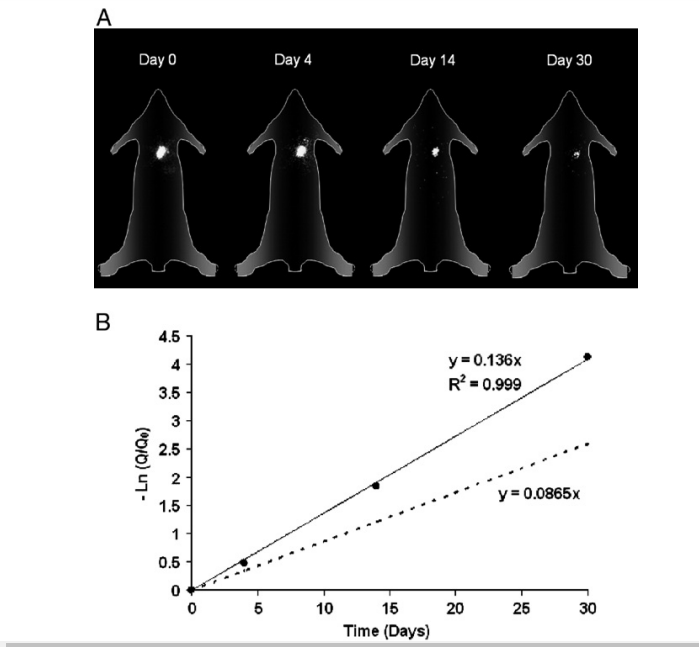 Figure 6. A: Representative scintigraphy images, showing 131I activity decay and lack of body distribution of 131I-NC. B: The decay of 131I activity at the site of implantation, expressed as the negative values of the natural logarithm of radioactive fraction remaining with time. Solid line: total elimination (including biological elimination); Broken line: calculated decay of the radioisotope only.