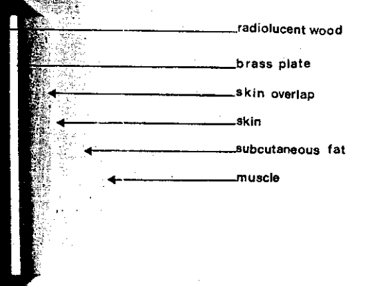 The skin thickness on the ulnar aspect of the forearm at a constant distance from the elbow was measured using the x-ray frame shown in Figure 1. The frame consisted of a mahogany rectangular block, 4 cm long and 15 mm wide, pressing against the ulnar aspect of the forearm with the central beam directed at 90° horizontally against the cross-section of the skin. This design eliminated the blurring of the edges at the top of the epidermis and the bottom of the dermis caused by the convexity of the arm. Mahogany is radiotrans- lucent, like subcutaneous tissue. Because skin is not radiotranslucent, compression of the skin with a wooden block makes the top of the epidermis and the bottom of the dermis clearly visible. The skin appears as a thick radio-opaque band between two parallel lines, gently compressed between the radiotranslucent wooden block and the subcutaneous tissue (Figure 2). A 1-mm brass plate was placed in the wooden block 0.5 mm from the functional edge. This showed sharply on the x-ray films and was used as a control to correct the skin thickness measurements.