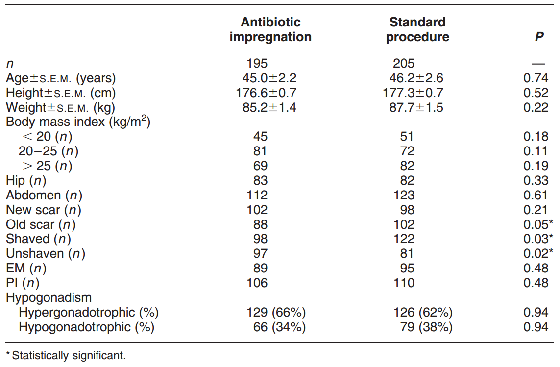 Design: Prospective, randomised, parallel-group, open-label study design in a single centre. One hun-dred and eighty-six androgen-deficient men (400 implantation procedures) were randomised into either a group who had their pellets soaked for ~2 min in gentamicin solution prior to implantation, or a control group who had the standard implantation procedure.