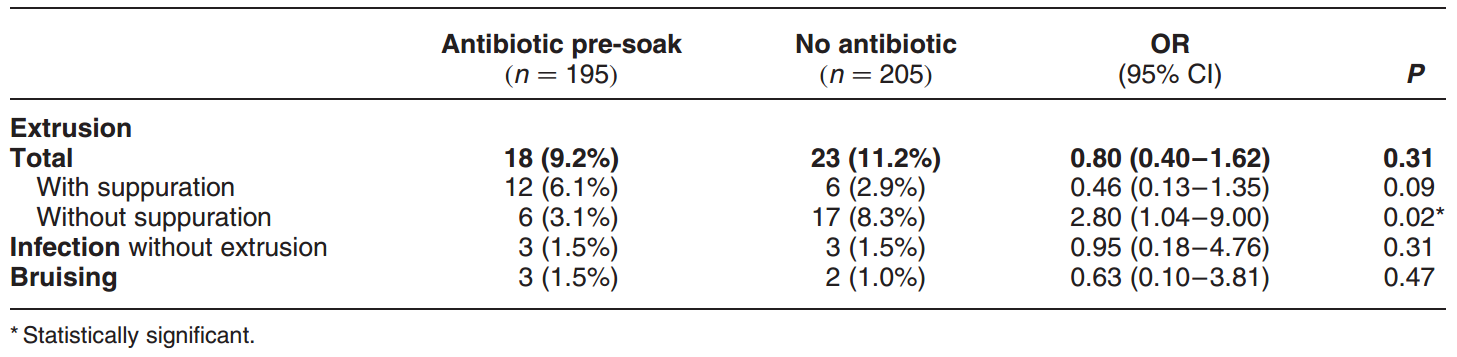 The overall extrusion rate for this study (10.25%) approximates the extrusion rates of the previous studies conducted in this centre (13, 16, 17). Whilst gentamicin pre-soak fails to decrease the overall extrusion rate, there is some evidence that it may be effective against slow-growing pathogens which result in ‘late’ extrusions. A further study trialling either a different antibiotic or a higher dose and/or longer exposure of antibiotic needs to be undertaken and procedure- related infection-control procedures may warrant further evaluation.