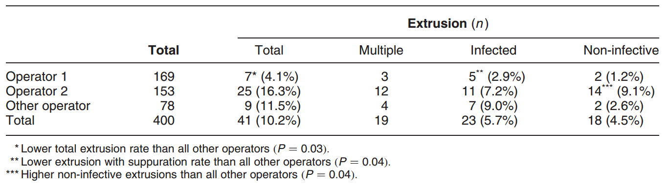 This study demonstrated that the operator performing the procedure can influence the likelihood of both extrusion and infection. Somewhat unexpectedly, one of the two experienced operators in this study had a lower infection-related extrusion rate and lower total extrusions than other operators (Table 3), and the other more-experienced operator had a higher infection- related extrusion rate (in both the control and the experimental groups) than all others (Table 3). Independent observers could not identify systematic procedural differences between operators. The increased likelihood of multiple extrusions, confirming previous findings, and the relationship of operator to extrusion rate suggest a operator/procedure-related cause for extrusion.