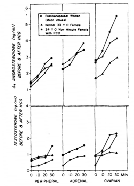 The menopausal ovary loses it capability to aromatize sex steroids; the lack of conversion of Δ4androstenedione to estrone, and testosterone to estradiol, results in elevatefl levels of serum androgens. Judd, Lucas, and Yen33 reported the results of ovarian and peripheral vein blood values of androgens in menopausal women. The mean ovarian testosterone levels were 15-fold higher than in the antecubital vein, and Δ4androstenedione levels were four to five times higher. Judd and co-workers concluded that ovarian Δ4andro- stenedione and testosterone secretion is greater in postmenopausal than in premenopausal women.