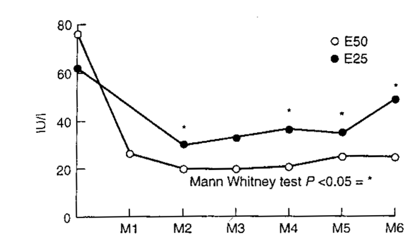 Our findings suggest that for most menopausal women, a relatively low serum oestradiol level is required for climacteric symptom control. The 25 mg implant dosage produces an oestradiol level which exceeds this threshold, even towards the end of the six- month treatment period. However, it was our impression that higher oestradiol levels resulted in better symptom control in some women with more resistant symptoms, suggesting some inter-individual variation in the symptom response threshold. Nonetheless, these data suggest that the ‘default’ dose should be 25 mg for symptom control.