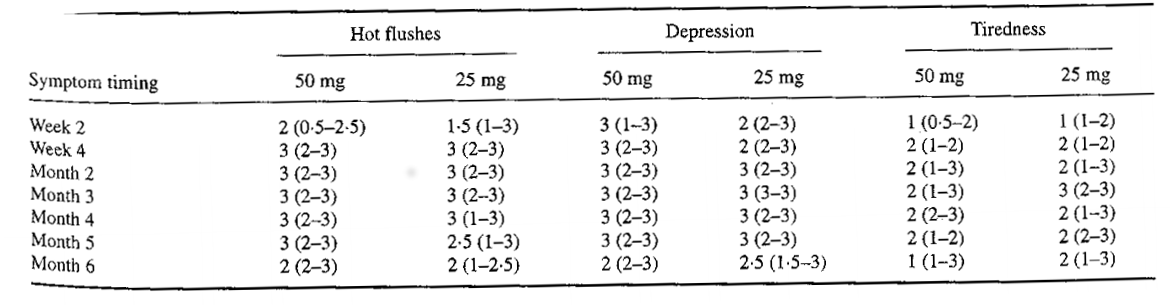 No serious adverse experiences were recorded. Minor adverse events were all related to the return of climacteric symptoms. These were hot flushes and sweats (one receiving 25 mg and four receiving 50 mg), mild depression (one in each group), tiredness (one receiving 25 mg) and vaginal dryness (one receiving 50 mg).