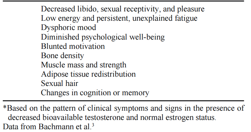 An international consensus conference on androgen in-sufficiency in women was convened in Princeton, NJ, in 2001. Because of the lack of sufficient epidemiological data and limitations of current laboratory assays, a conservative definition of androgen insufficiency in women (Table 1) was proposed on the basis of 3 essential criteria. First, clinical symptoms of androgen insufficiency should be clearly present. Symptoms of androgen insufficiency most often reported in the literature include a diminished sense of well-being or dysphoric mood; persistent, unexplained fatigue; and sexual function changes, including decreased libido, sexual receptivity, and pleasure. Second, because estrogen effects are also strongly linked to mood, psychological well-being, and sexual function in women, androgen insufficiency should be diagnosed only in women with adequate estrogen status. Third, in the absence of a sufficiently sensitive assay or absolute threshold for androgen insufficiency in women, free testosterone values should be at or below the lowest quartile of the reference range for reproductive age (20-40 years) in conjunction with the presence of clinical symptoms and adequate estrogen status.[3] To assist clinicians in making a diagnosis and initiating therapy, a simple management algorithm was proposed (Table 2).[3]