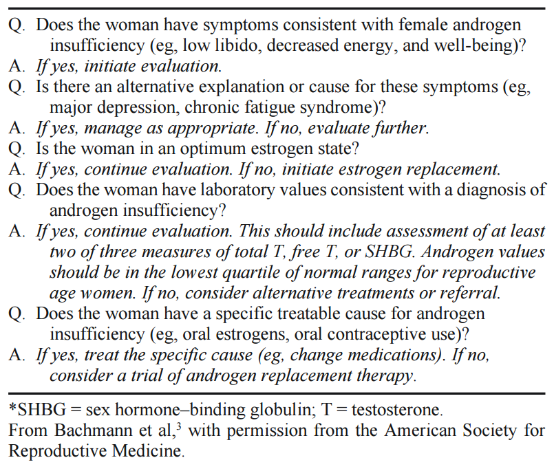 Bachmann G, Bancroft J, Braunstein G, et al. Female androgen insufficiency: the Princeton consensus statement on definition, classification, and assessment. Fertil Steril. 2002;77:660-665.
