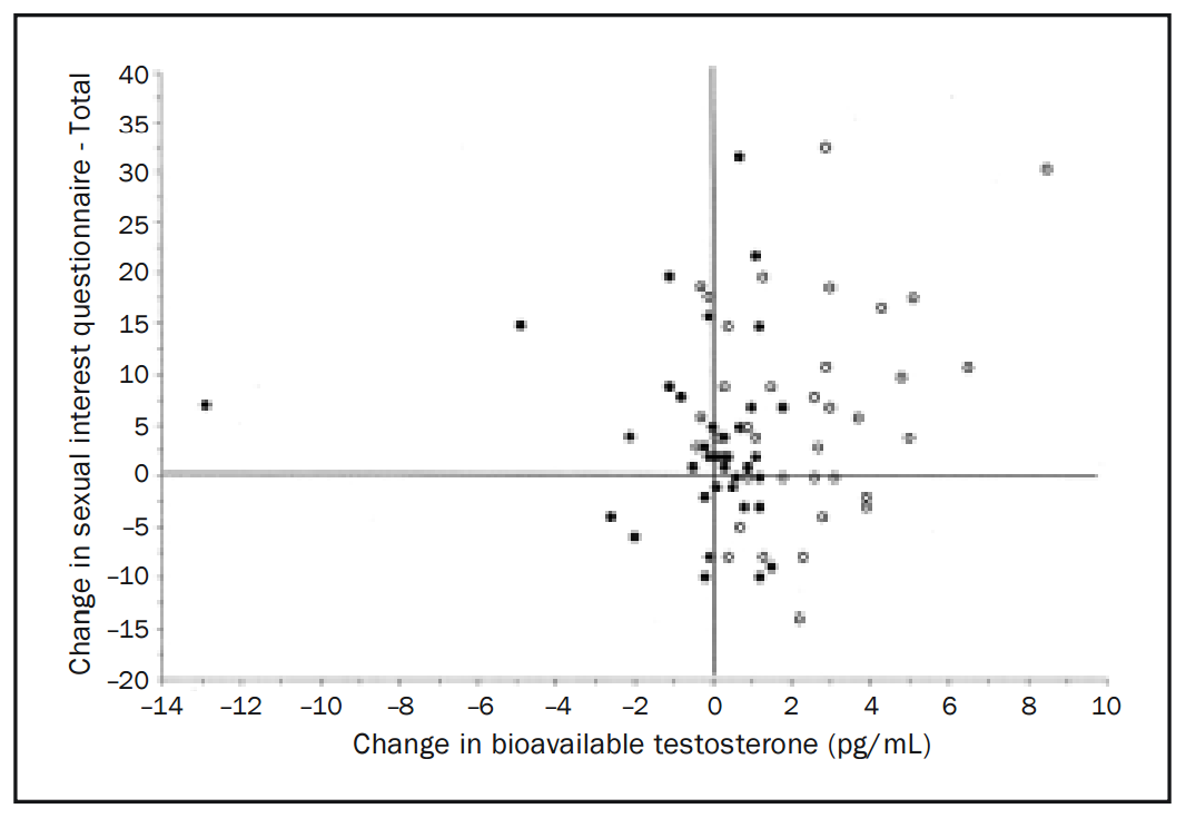 Figure 1. Association between change in score on sexual interest questionnaire and change in bioavailable testosterone concentrations from baseline to week 16. Each open circle and closed circle represents a single participant receiving esterified estrogen and methyltestosterone or esterified estrogens alone, respectively. Most open circles cluster in the right upper quadrant of the graph, indicating a significant correlation between an increase in bioavailable testosterone and improvement in score on sexual interest questionnaire for those who received combination therapy. From Lobo et al,[12] with permission from the American Society for Reproductive Medicine.