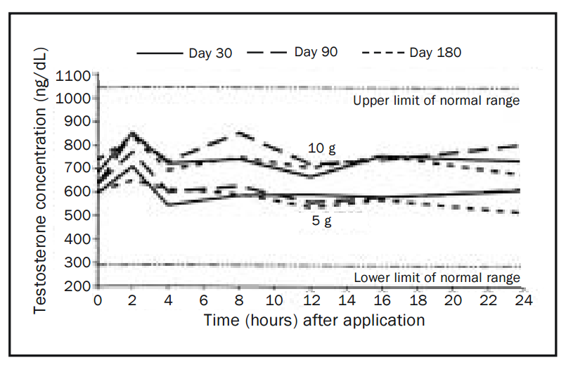 Figure 2. Mean steady-state testosterone concentrations in patients who used testosterone gel (AndroGel, Unimed Pharmaceuticals, Inc, a Solvay Pharmaceuticals, Inc, company, Deerfield, Ill) once a day. Testosterone concentrations were maintained as long as the patient continued to apply the prescribed treatment properly.[21]