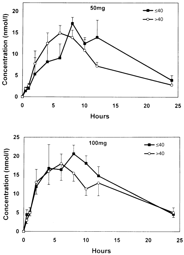 Figure 2. Comparison of plasma progesterone concentrations (mean ± SD) after administration of progesterone-containing vaginal tablets in women 40 years and younger and in women older than 40 years. Evaluation for 50 mg (upper) and 100 mg (lower) vaginal tablets
