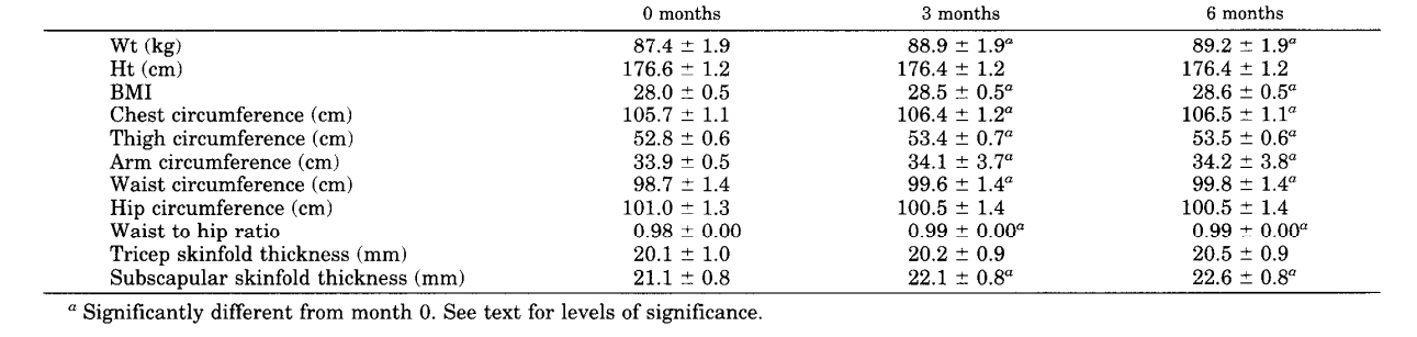 Body weight and body mass index increased with T re-placement. Both parameters were significantly higher at 3 and 6 months (P = 0.0001 for both) than before treatment. The body circumferences measured at the chest, waist, thigh, and midarm showed significant increases after treatment compared to baseline (chest, P = 0.029; waist, P = 0.023; thigh, P = 0.0104; midarm, P = 0.030). The waist to hip ratio was also increased at 3 and 6 months (P = 0.0076). The subscapsular skin-fold thickness showed a very small increase (P = 0.0024).