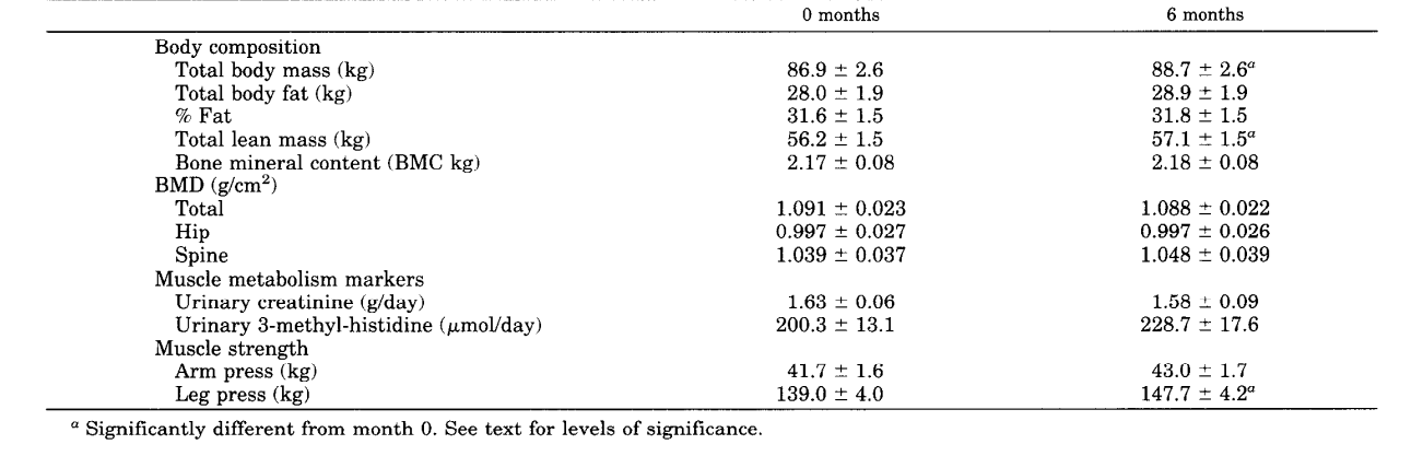 For the subjects assessed at the Harbor-UCLA Medical Center (n = 34) several additional tests were performed at 0 and 6 months. Total as well as regional body composition and BMD were assessed by dual energy x-ray absorptiometry (DEXA), using Hologic QDR 2000 (Hologic, Waltham, MA). The one-repetition maximum technique was used to measure arm and leg muscle strength in bench press and seated leg press exercises. Twenty-four-hour urine collections for creatinine and 3-methyl-histidine assays were assessed after 3 days of a meat-free diet in the home environment.